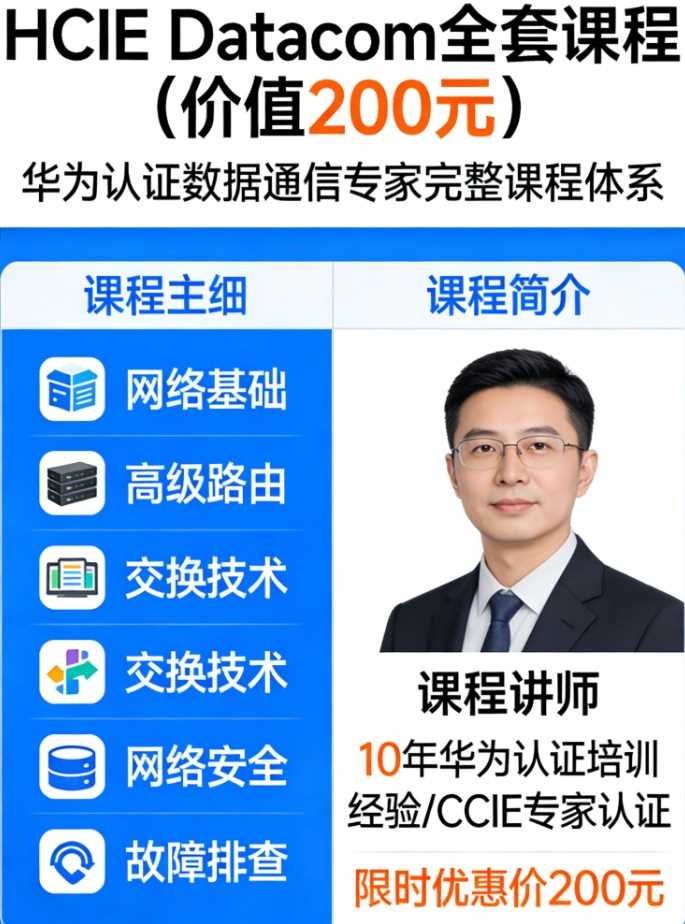 本课程涵盖HCIE Datacom大纲中的主要内容,除去部分纯理论,其余都能通过实验验证,主要包含以下内容:IGP高级特性、BGP/MPLS、IPv6、QoS、VXLAN、SR、SRv6等主流技术。